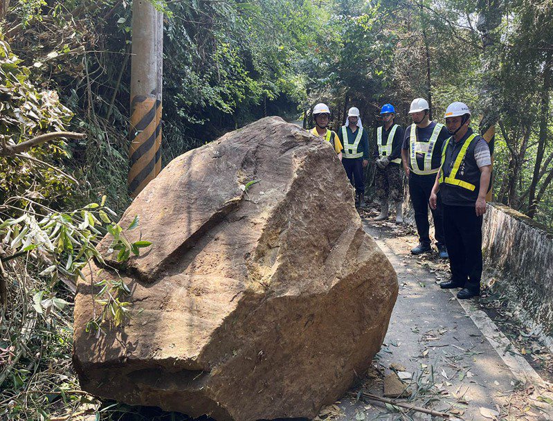 0403花蓮強震復興區大窩部落必經鄉道,掉落3、4噸重巨石擋路,區長蘇佐璽(右一)會勘指示下班前通行。圖/復興區公所提供