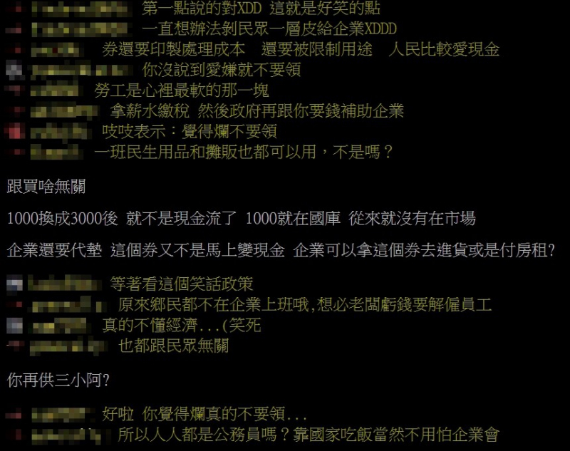 該文章掀起論戰,更讓一名鄉民還另PO出3點吐槽,首先「幫的是企業,不是你一般民衆。」他質疑,「好阿幫企業,那關一般民衆屁事?還要人民先拿1000出來幫你做政策執行喔?你直接國庫補助企業不就好啦,這樣區公所、里長還不用加班,少出加班費。」