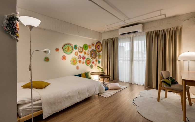 入住「Alife 雙人套房」,可以在客籍藝術家楊芳宜編織作品環繞的房間裡,感受「住房即藝廊」的概念,其作品《塑圓》以回收塑料創作編織出象徵湯圓、柿子等,客家文化常出現的圖像、飲食文化色彩,不只帶出惜物的精神,也體現圓滿、團圓的意涵。