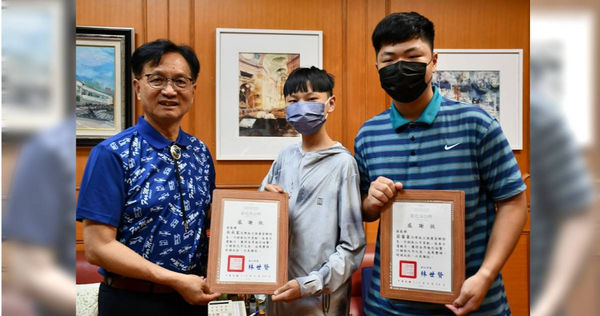▲彰化市長林世賢頒發感謝狀表揚吳承家(中)、莊睿豪(右)。(圖/彰化市公所提供)