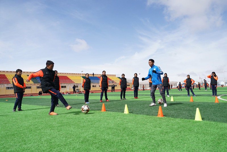益增藏族兒童被北京送到寄宿學校實施漢語教育,導致幼童被迫與父母分開。圖爲在青海省玉樹藏族自治州曲麻萊縣一足球場上,孩子們正在進行訓練。 中國新聞社