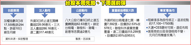 統一投顧董事長黎方國、富邦投顧董事長蕭乾祥及凱基投顧董事長朱晏民一致看好臺股後市,認爲臺股漲多後拉回屬於良性修正,美國降息已成定局,看好這波多頭漲勢延續;下週挾CES展及大選行情加持,將重返漲勢,而選後不確定因素消除,臺股可望隨着題材再度燃起多頭火種,建議逢低承接佈局,預期這波臺股指數可能低點至17,100點,但不排除17,500點附近就止跌,元月仍有機會衝刺萬八。