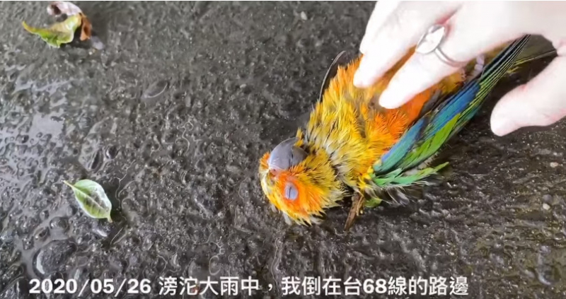 ▲大雨中撿到一隻奄奄一息的金太陽鸚鵡,當時牠的狀況很糟。(圖/取自臺68線的小金太陽,下同。)