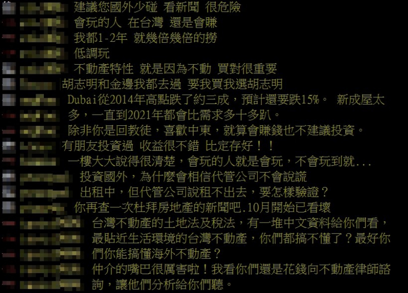 文章一貼出,一派網友認爲要三思,「建議您國外少碰,看新聞很危險」、「Dubai(杜拜)從2014年高點跌了約三成,預計還要跌15%,新成屋太多,一直到2021年都會比需求多十多趴,除非你是回教徒,喜歡中東,就算會賺錢也不建議投資」、「投資國外,爲什麼會相信代管公司不會說謊?出租中,但代管公司說租不出去,要怎樣驗證?」、「你再查一次杜拜房地產的新聞吧,10月開始已看壞」。
