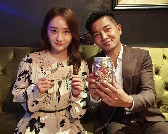 陳德容(左)拍《山中森林》殺青戲,謝承均送上花藝小禮物和卡片。(圖/禾力文創。花藝/寶石箱的花)