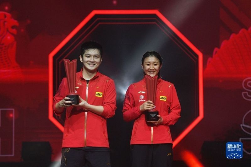 樊振東、陳夢宣佈退出世界排名,引發各界關注。圖爲兩人2022年在一項頒獎儀式上合影。(新華社)