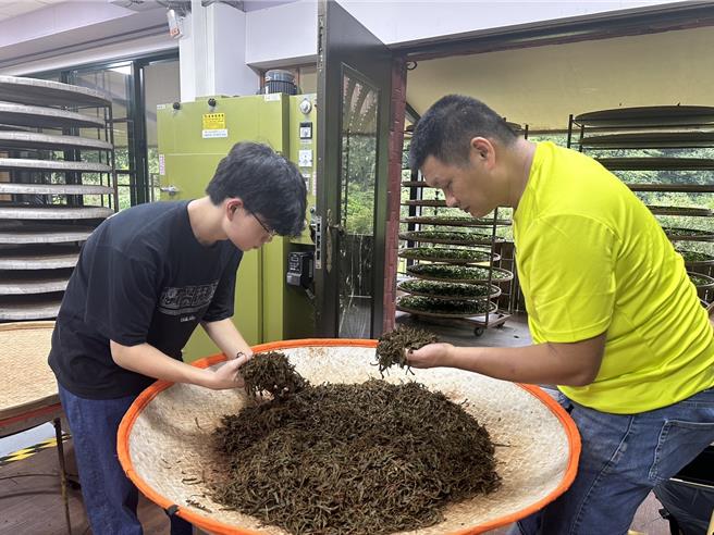 茶農蔡旭志(右)仔細教兒子製茶技術。(農業局提供)