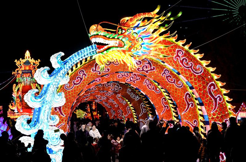 遊客在河南洛陽王城公園龍年燈會上參觀遊園。(新華社)
