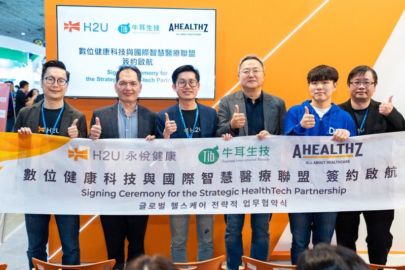 H2U永悅健康(左三爲董事長暨執行長陳俊嘉)偕韓國最大醫檢集團SCL以旗下AhealthZ (右三爲AhealthZ CEO Joon Yun Kim)及臺灣牛耳國際生技(左二爲牛耳生技執行長李立國),三方共同簽署國際智慧醫療聯盟合作備忘錄,助力韓國高端醫療器材進駐臺灣,並推動數位健康技術輸出海外。 圖/H2U永悅健康提供