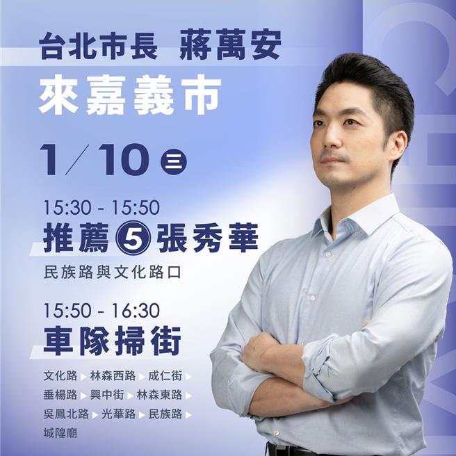 張秀華預告10日上午9點30分至11點30分趙少康來陪車掃,10日下午3點半至4點半蔣萬安陪車掃,已有藍軍支持者號召民衆站出來到街頭相挺,熱鬧場面可期。
