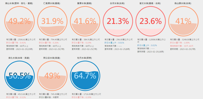 南部主要水庫如湖山、仁義潭、蘭潭、曾文、烏山頭與南化水庫,蓄水量都已出現明顯下降,其中曾文水庫僅剩23.6%,剩餘水庫也都在32%至49%,南化水庫雖仍有50.5%,但單日水量下降高達0.52%,烏山頭水庫更是出現單日下降1%的可怕數據。