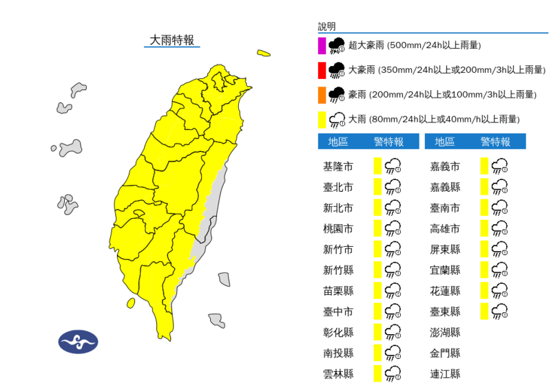 大雨特報影響時間:08日下午至08日晚上大雨:基隆北海岸、臺北市、新北市、桃園市、新竹市、新竹縣、苗栗縣、臺中市、彰化縣、南投縣、雲林縣、嘉義市、嘉義縣、臺南市、高雄市、屏東縣、恆春半島、宜蘭縣、花蓮縣山區、臺東縣山區