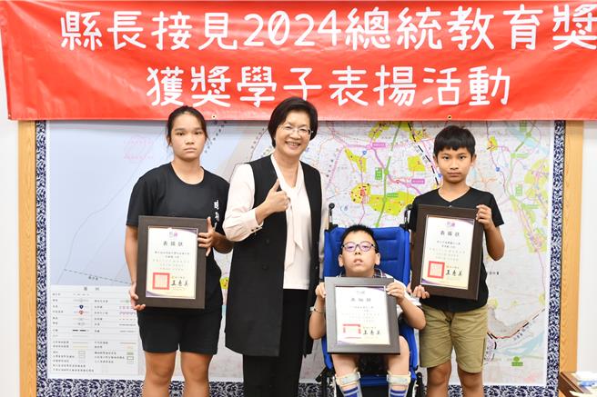 彰化縣今年有3名學生榮獲總統教育獎,分別是萬來國小嚴宇浩(右二)、縣立成功高中國中部何姍頤(左一)及南興國小唐羽勤(右一),彰化縣長王惠美(左二)在縣長室表揚。(彰化縣政府提供/孫英哲彰化傳真)