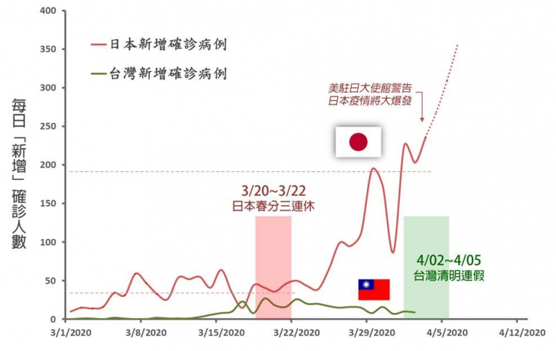 徐丞志圖表顯示,日本在3月20日到22日是三天連休,當時剛好遇到櫻花盛開,各大景點人山人海,當週平均每日新增的確診數約爲40人。而收假之後十天,日本國內每日新增確診數陡增至200人,新增的速度是連假前的5倍,並且持續上升中,美國大使館甚至在昨日(3日)提出警告,日本疫情即將大爆發。