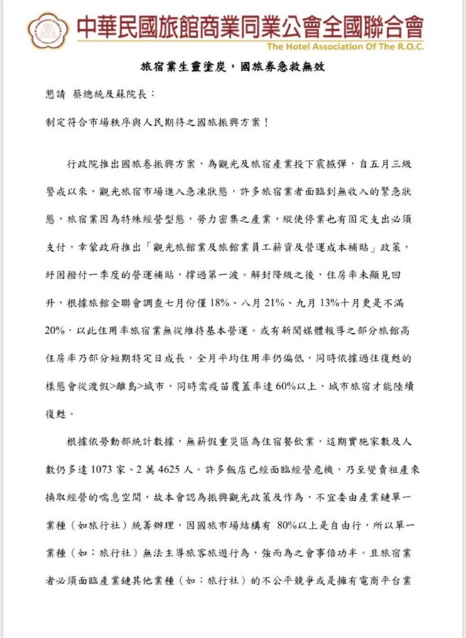 中華民國旅館商業同業公會27日以「旅宿業生靈塗炭,國旅券急救無效」爲題,籲請總統、行政院長制定符合市場秩序與人民期待之國旅振興方案。(中華民國旅館商業同業公會提供)