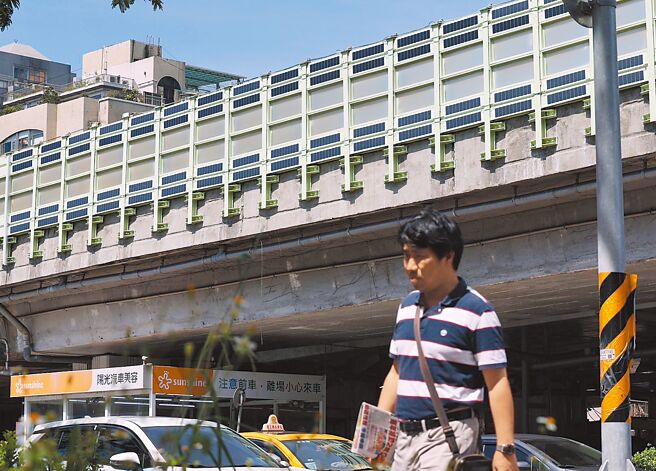 臺北市環保局在建國高架橋,打造全國首座高架橋隔音牆太陽光電系統,裝置輕薄型太陽能光電板,採自發自用模式提供橋下清潔隊空調使用,達到節能目的。(陳俊吉攝)