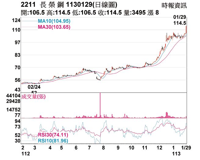 大選過後預期公共工程可望重新啓動,鋼構廠業績前景看好,激勵長榮鋼(2211)29日股價大漲8元、收114.5元,股價創歷史新高,外資、自營商雖轉買爲賣,但投信繼續大力加碼,已連續31買。