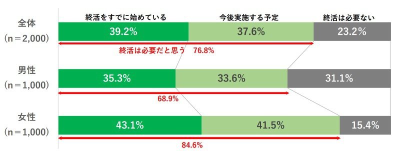 日本女性雜誌《ハルメク》在今年4月曾針對50至79歲,共2,000名民衆做了終活調查。數據顯示日本人對於終活有普遍認知,有76.8%的人認爲終活是必要的,更有39.2%的人已經開始終活。而其中,擁有終活意識與行動的,都以女性佔較高比例。
