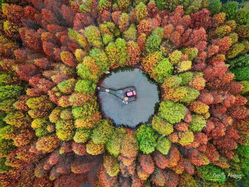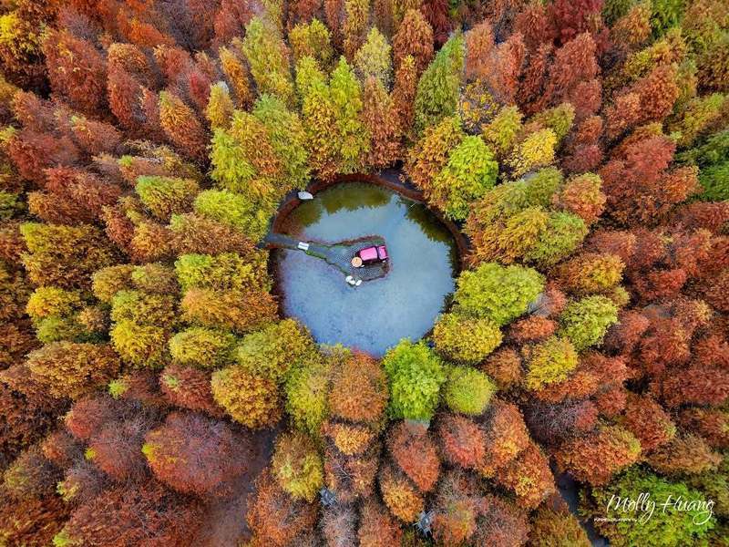 「羽粼落羽鬆」進園的遊客們或站或坐,或利用各式造景來展現落羽鬆合影的美感。而令大家意想不到的是,擁有空拍技術的攝影師莫莉,將空拍攝影機向上飛翔,凌空俯瞰的視野,完全成了「上帝的視角」,驚奇地發現圓形水池區被環形落羽松林層層疊疊地包圍着,視覺震撼感十足!
