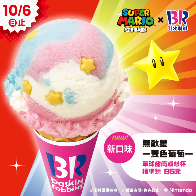 今年以超狂的 「無敵星」新口味冰淇淋爲主題,這款「無敵星 雙色葡萄」以葡萄雪酪、麝香葡萄雪酪,再加上黃色星型糖果的純白奶香冰淇淋,顏色超繽紛多彩,多重滋味一次擁有,期間限定單球甜筒或紙杯95元,而8/22起只要購買藍色、紅色2種紙杯圖案的「超級瑪利歐 雙球杯」,還加碼送以「路易吉洋樓」爲設計的迷你資料夾。