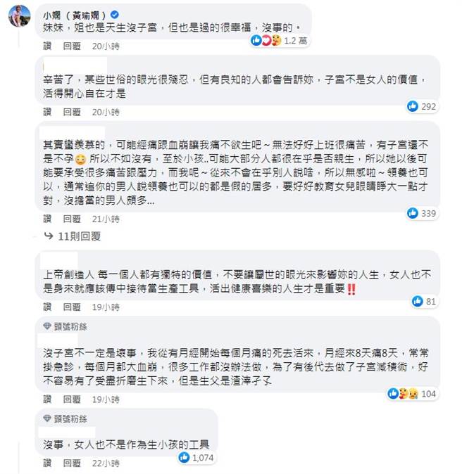 這則PO文被轉貼到《Dcard》臉書粉專後,迅速引起廣大的迴響,連藝人小嫺都被觸及到,昨(2/28)留言送暖:「妹妹,姐也是天生沒子宮,但也是過的(得)很幸福,沒事的。」短短一句話就富含滿滿的正能量,不到一天就獲得1.2萬網友按贊,其餘網友也紛紛安慰原PO:「辛苦了,某些世俗的眼光很殘忍,但有良知的人都會告訴妳,子宮不是女人的價值,活得開心自在纔是」、「沒有人天生都是完美的」。
