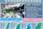 氣象局預報,週一、週二各地大多爲多雲到晴,東南部地區及恆春半島有局部短暫陣雨,午後西半部地區及東北部、東部山區有局部短暫雷陣雨,有局部較大雨勢發生的機率;週三至週六東半部及恆春半島有局部短暫陣雨,其他地區爲多雲,午後有局部短暫雷陣雨,依舊有局部較大雨勢發生的機率。