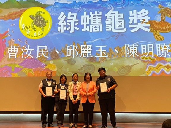 管碧玲指出,在地守護計劃從第一年18個民間團體到今年的59個團體,從生態系覆育、海洋公民科學家、友善釣魚行動、海洋保育推廣及潔淨海洋行動5大角度執行相關工作。她致贈「綠蠵龜獎」給服勤時數逾百小時的海洋保育志工,也發感謝狀給臺灣水泥及財團法人日月光環保永續基金會,感謝對海洋保育的貢獻。