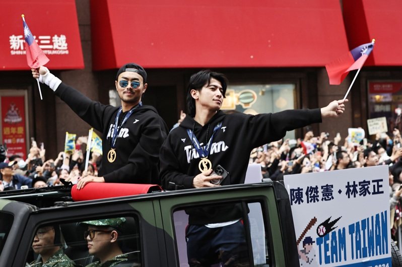 「棒球英雄 臺灣尚勇」大遊行,中華隊隊長陳杰憲(右)與隊員林家正(左)在吉普車上向球迷揮舞國旗致意。記者杜建重/攝影