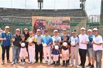 潘武雄(左二)與大小兒子一同完成開球儀式,並與太太一起在場中留下全家福合影。(中央社)