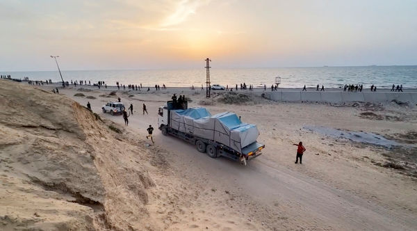 ▲卡車載着人道援助物資,進入飽受摧殘的加薩地區。(圖/路透)