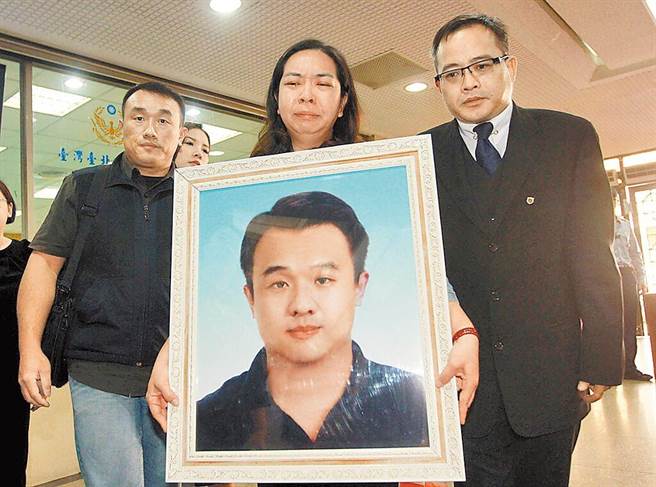 2014年11月28日,臺北地方法院首次開庭審理臺北市警局偵查佐薛貞國遭黑幫分子圍毆殺害案,遺孀黃嘉鳳(中)帶着薛貞國遺照到庭,希望法官能還給薛貞國一個公道。(本報資料照片)