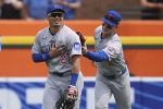 小熊隊右外野手鈴木誠也(右)漏接飛球,中外野手貝林傑(左)趕來支援。(美聯社)