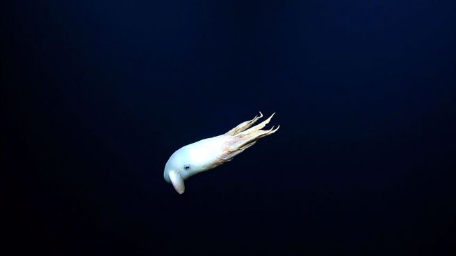 美國海洋研究團隊「海洋探勘信託」(Ocean Exploration Trust)日前在北太平洋深海探索時,意外發現一隻罕見章魚,牠的外表白白胖胖,利用2個大大的鰭游泳前進,宛如迪士尼卡通中的小飛象一樣。探測船清楚拍下牠的身影,影片曝光4天,已吸引至少10萬網友觀看,對深海的奧秘驚歎不已。