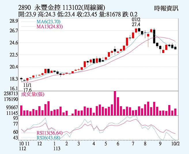 永豐金11日股價收在23.45元,下跌0.15元、0.64%,整週下跌0.85%,三大法人合計周賣超32,346張。技術線型觀察,目前在周線、月線和季線之下,股價進入潛伏期,待獲利持續向好將有機會反彈上攻。
