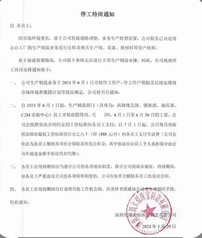 按照上述通知,周大福深圳南山工廠生產製造業務於2024年6月1日開始停工停產。“停工停產期限及後續安排視市場環境和集團計劃等情況確定,公司將另行通知”。