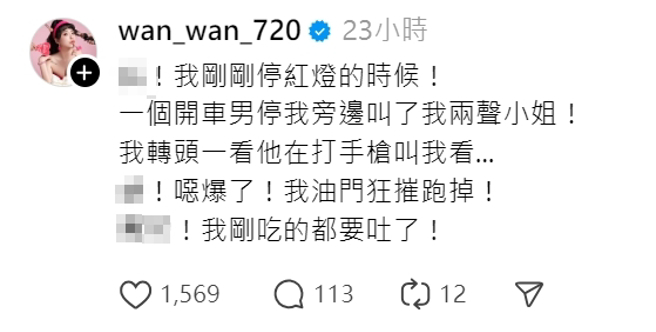 宛宛兒6日在Threads上發文,她表示自己剛剛停紅燈的時候,一個開車男子,停在她旁邊,叫了她兩聲「小姐」,她一轉頭,就看到對方在打X槍,還叫她看。讓她不滿狂飆髒話,她直呼:「X!惡爆了!我油門狂摧跑掉!XX!我剛吃的都要吐了!」