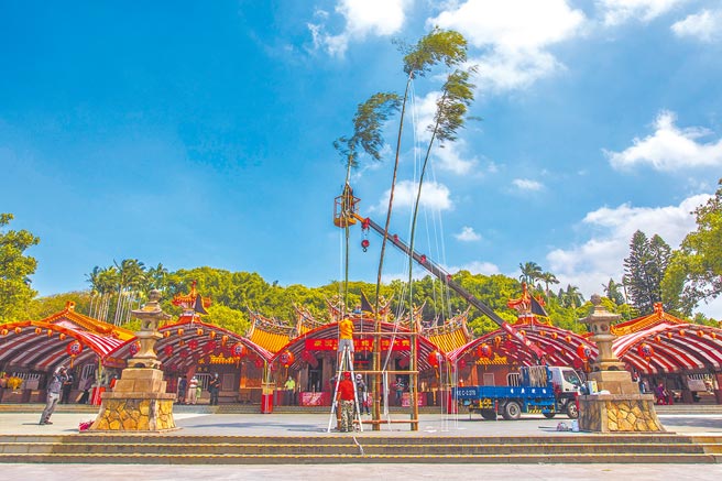 2021新竹縣新埔鎮褒忠亭義民廟祭典將進入重頭戲,25日傳統的「豎燈篙」登場,以往要動用10人以上把3支長竹綁在架上,隨着時代進步已改用吊車協同人力作業,在廟前廣場花了約半小時矗好3根燈篙,指引「好兄弟」前來接受普渡。