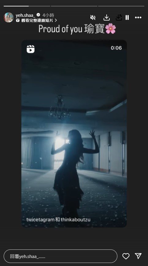 舒華透過IG限時動態分享宣傳子瑜新歌MV,並寫下「Proud of you 瑜寶」、「子瑜盡情跑吧 別怕 我們永遠是妳的後盾」,贊子瑜漂亮,爲好友應援。