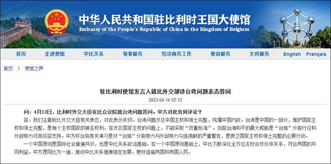 大陸駐比利時使館發言人表示,中方注意到比利時外交大臣拉比卜有關表態,對此表示關切。臺灣是中國的一部分,臺灣問題涉及中國主權和領土完整,純屬中國內政。
