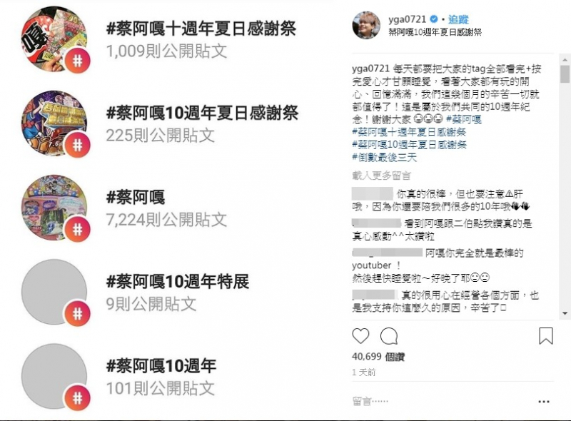 而蔡阿嘎不管再忙,還是堅持看完所有粉絲展覽的貼文,才寧願去睡覺的舉動,也讓網友紛紛留言大讚:「蔡阿嘎真的好有心」、「好照顧粉絲啊」、「辛苦你了!真的超甘心的」、「你是最棒的YouTuber」。