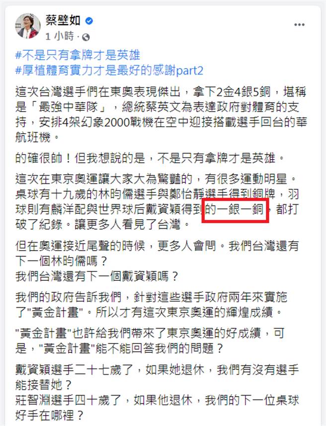 蔡壁如今在臉書談及東奧,呼籲政府厚植體育實力,不過文中卻指「羽球則有麟洋配與世界球后戴資穎得到的一銀一銅」。事實上,麟洋配勇奪金牌,戴資穎則拿下銀牌。