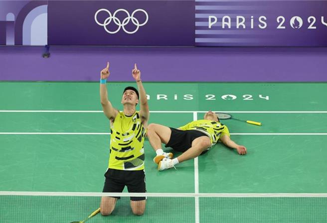 李洋/王齊麟在驚險擊敗大陸選手奪金後,李洋累翻倒地,王齊麟興奮地跪在地上霜手指天,慶祝得來不易的金牌。(中時奧運採訪團)