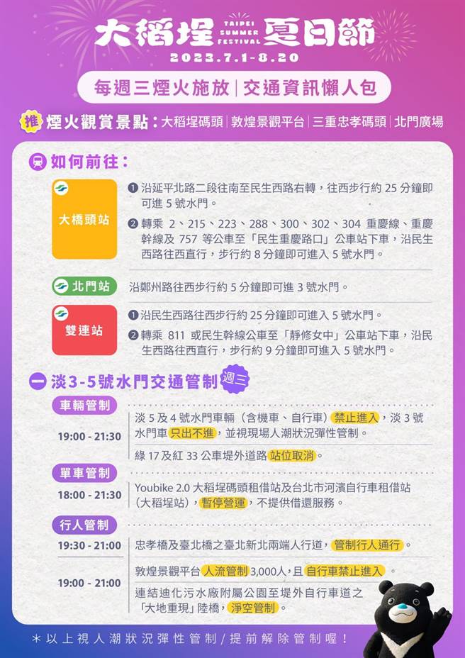 觀傳局表示,大稻埕夏日節將有「7+1場煙火秀」輪番上陣,每週三的主題煙火秀選在晚間8時30分施放,避開下班尖峰時段,降低對交通影響;同時,大稻埕碼頭水門將於每週三晚間7時到9時30分車輛管制,「淡5號」及「淡4號」水門禁止車輛進入,包含機車、自行車,「淡 3 號」水門車輛只出不進,含機車、自行車,但大客車與客運業者除外。