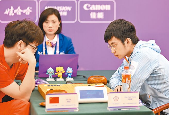 許皓𬭎(右)在杭州亞運男子圍棋金牌戰以3/4子擊敗地主名將柯潔,贏得我國首面亞運圍棋金牌。(中華奧會提供)
