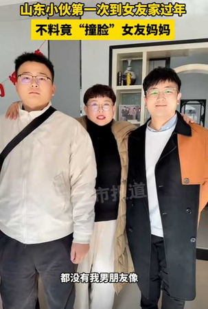 近日,一則有趣短片在中國網路上爆紅,河南省周口市一名女網友在網路發佈影片稱,自己今年春節帶着祖籍山東省棗莊的男友一起回老家過年,沒想到男友跟媽媽站在一起,竟然意外「撞臉」,嚇得她驚呼「也太像了吧?髮型、眼睛、鼻子、嘴」,還好笑表示:「我親弟弟跟我媽站一起,都沒有我男朋友像。」至於她自己,「我們3個站在一起拍照時,感覺男友纔像媽媽親生的,我在照片裡看起來就像個兒媳婦。」