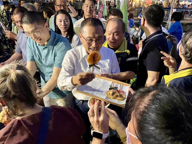 新北市長侯友宜與基隆市長謝國樑同臺出席行銷鎖管活動,發送鎖管及小卷產品給民衆。(徐佑升攝)