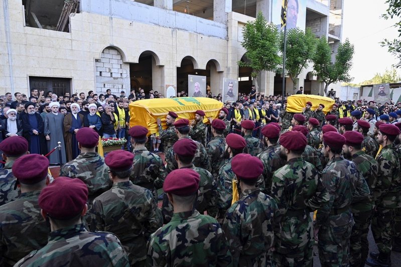 傳至少1500名真主黨戰士在通訊設備連環爆中遭炸瞎或被迫截肢。圖爲真主黨戰士擡着飛彈部隊指揮官古貝西的棺木併爲之送葬。(歐新社)