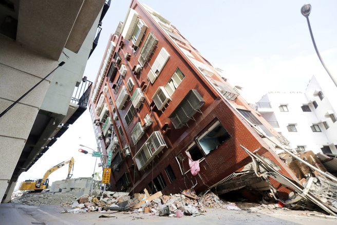 圖爲因7.2強震而傾斜的花蓮天王星大樓。(美聯社)