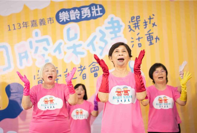 去年榮獲第1屆「潔牙比賽」冠軍隊-嘉義市幸福樂齡教育推展協會,今日受邀出席宣傳記者會開場表演。(呂妍庭攝)