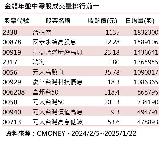 小資存股熱度不減,觀察金龍年上市櫃零股交易情況,前三名分別是臺積電與擁有穩定高息配息政策的00919羣益臺灣精選高息ETF以及00878國泰永續高股息ETF,這三檔最受小資族投資人青睞。進一步觀察前十大排行中,僅臺積電與鴻海個股上榜,其他八檔都是ETF,以臺股高息ETF佔6席最多,顯示出臺股高息ETF仍是小資族最愛。